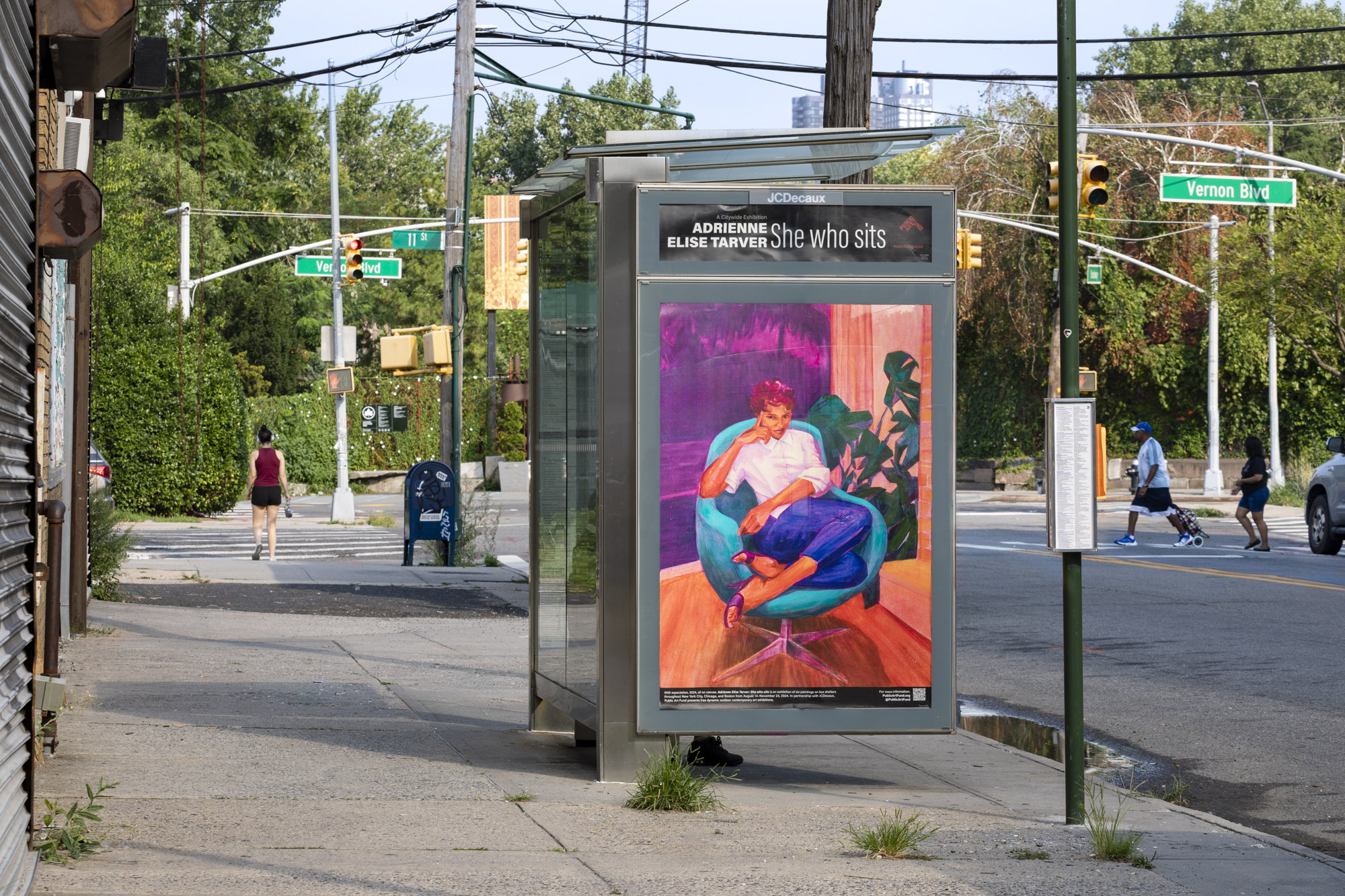 The artist’s latest exhibition, ‘She Who Sits,’ is on display across over three hundred bus shelters throughout New York City, Boston, and Chicago.