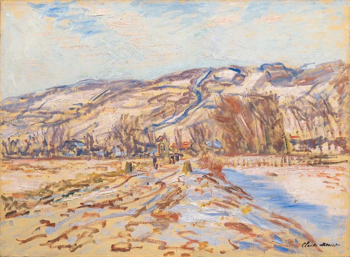 Claude Monet was a French Impressionist painter whose signature style of painting “en plein air,” or outdoors, to capture the effects of changing light, resulted in some of the world’s most celebrated landscapes. Hiver à Giverny, 1886, is a peaceful winter landscape that depicts the village of Giverny, where the artist lived for over 40 years.