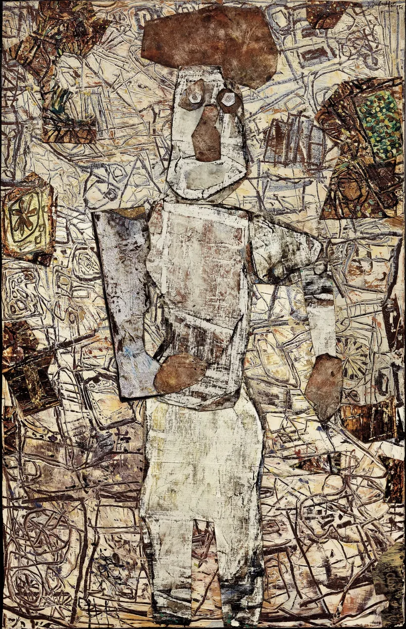 Jean Dubuffet was a French painter, sculptor, and founder of the Art Brut movement: an artistic movement that embraced the idea of raw, artistic expression unencumbered by mainstream culture. Dubuffet believed that the influence of mainstream culture suffocated genuine creativity, and worked to create outside the principles of the art world. He often employed unconventional materials–oil paintings like L’homme à la toque, 1956, were created using an impasto thickened by natural materials such as sand, tar and straw; and he often used elements of collage by recycling different discarded papers and other ephemera.