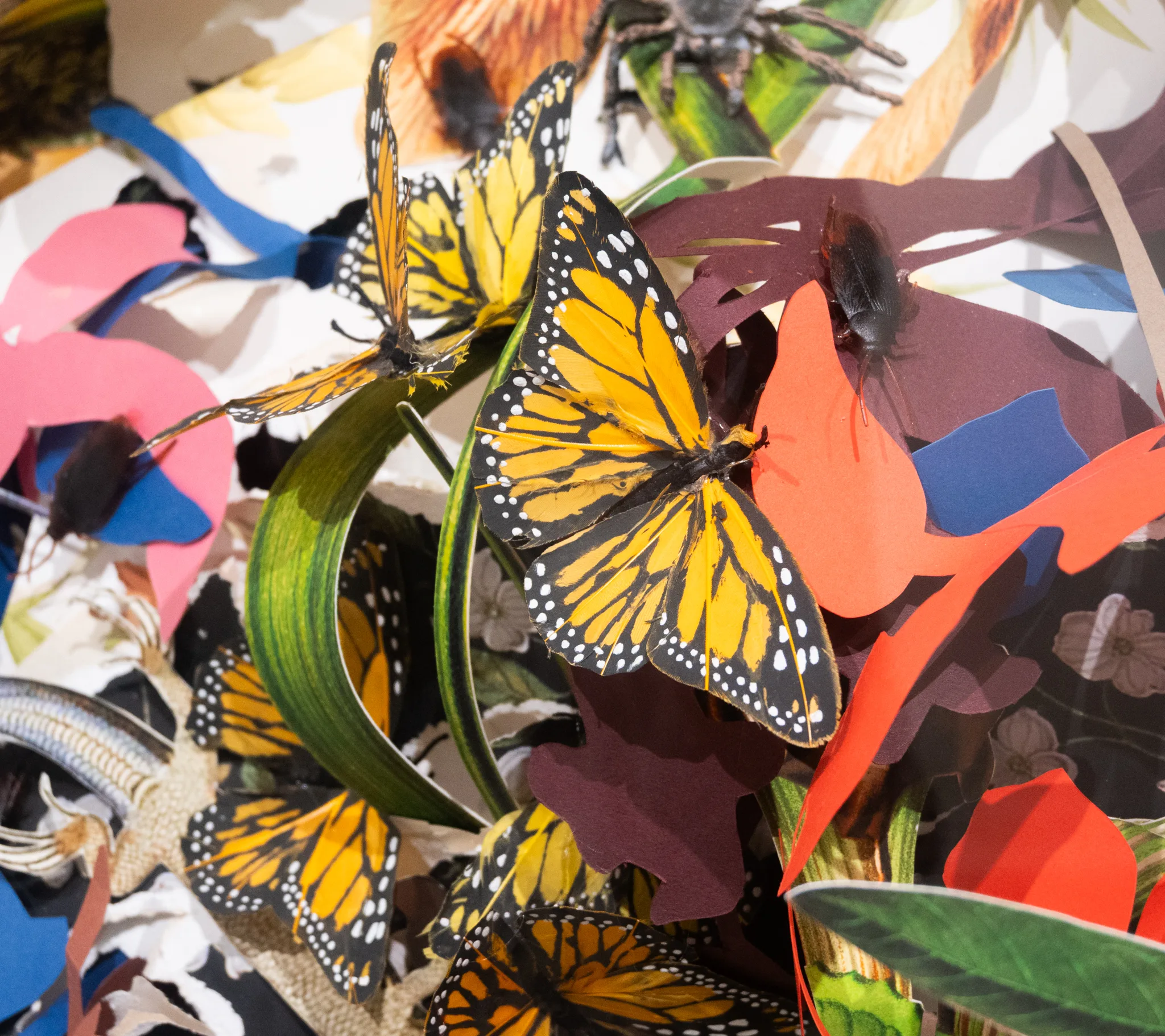 In …BENT… AND RIPPLED…, Patterson constructs a lush but fractured tableau: insects flutter across torn paper and printed floral motifs, forming a tapestry that is both seductive and unsettling. Beauty here is not an escape; it is a witness. The roaches and butterflies are not just decoration; they are memorials. They mark lives overlooked, erased, or discarded. The work is in a beautiful conversation with Hirst butterfly pieces where both of them reflect the fleeting time and the cycle of life.