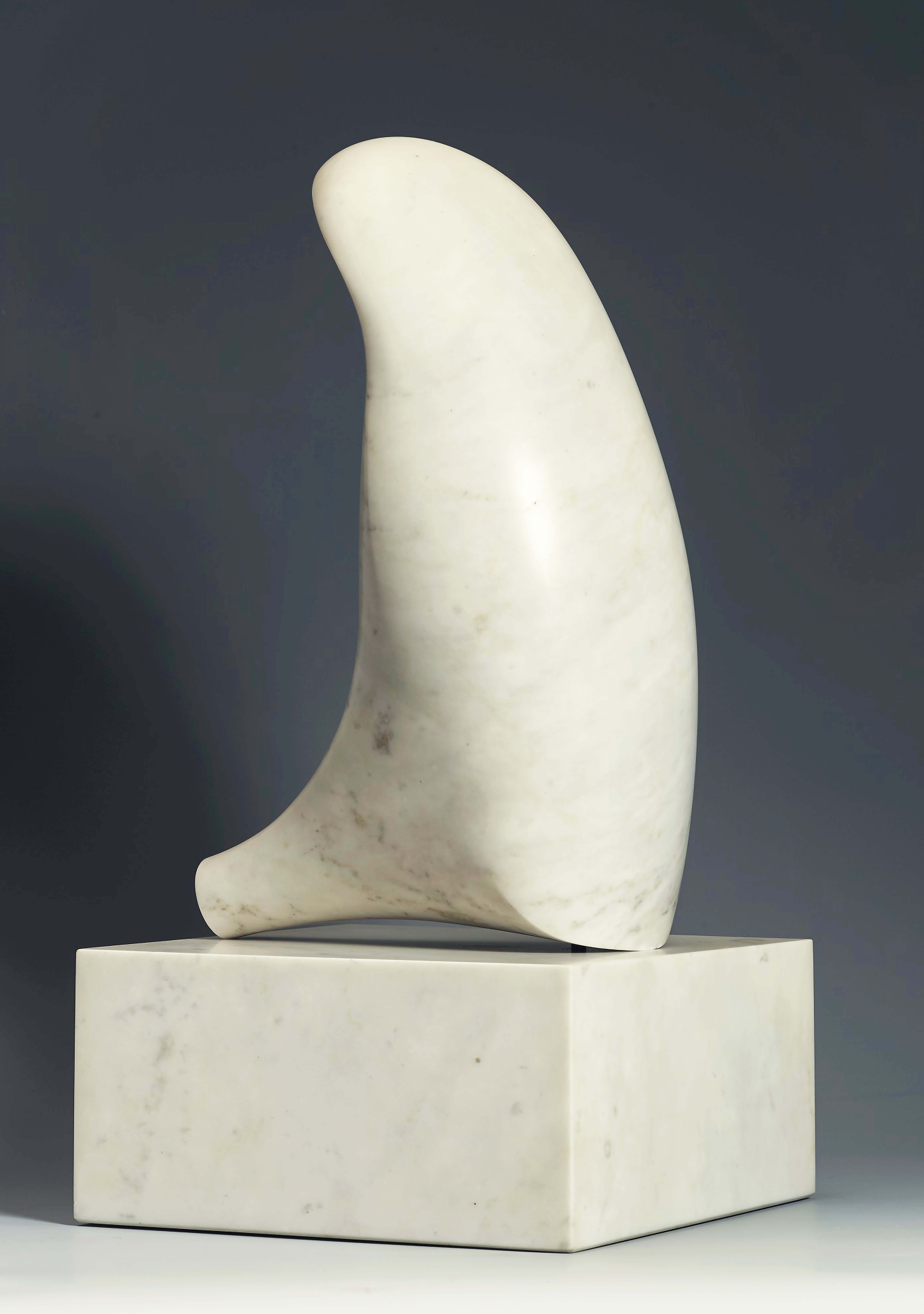 La Feuille (“The Leaf”) was carved in 1941, a period marked by war and upheaval. This marble sculpture captures Arp’s signature biomorphic style, fluid, balanced, and evocative of natural shapes. The leaf is a recurring motif in Arp’s work which becomes a vessel for metamorphosis, gently bridging the vegetal and the human, the symbolic and the sensual. In this sculpture, smooth undulations suggest both growth and surrender, a shape caught mid-transformation. It speaks in silence, like a fossilized breath of the natural world.